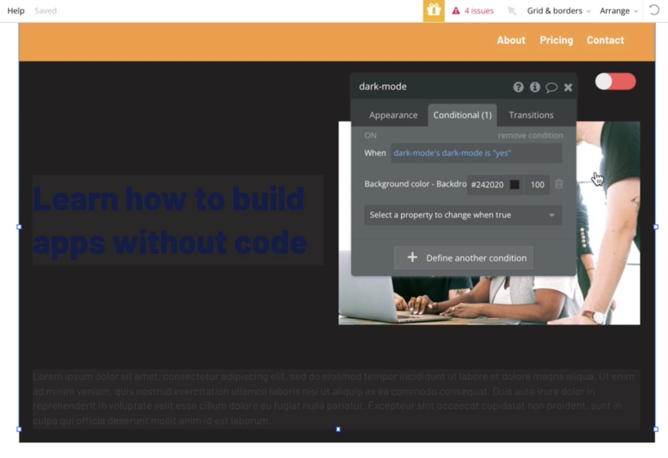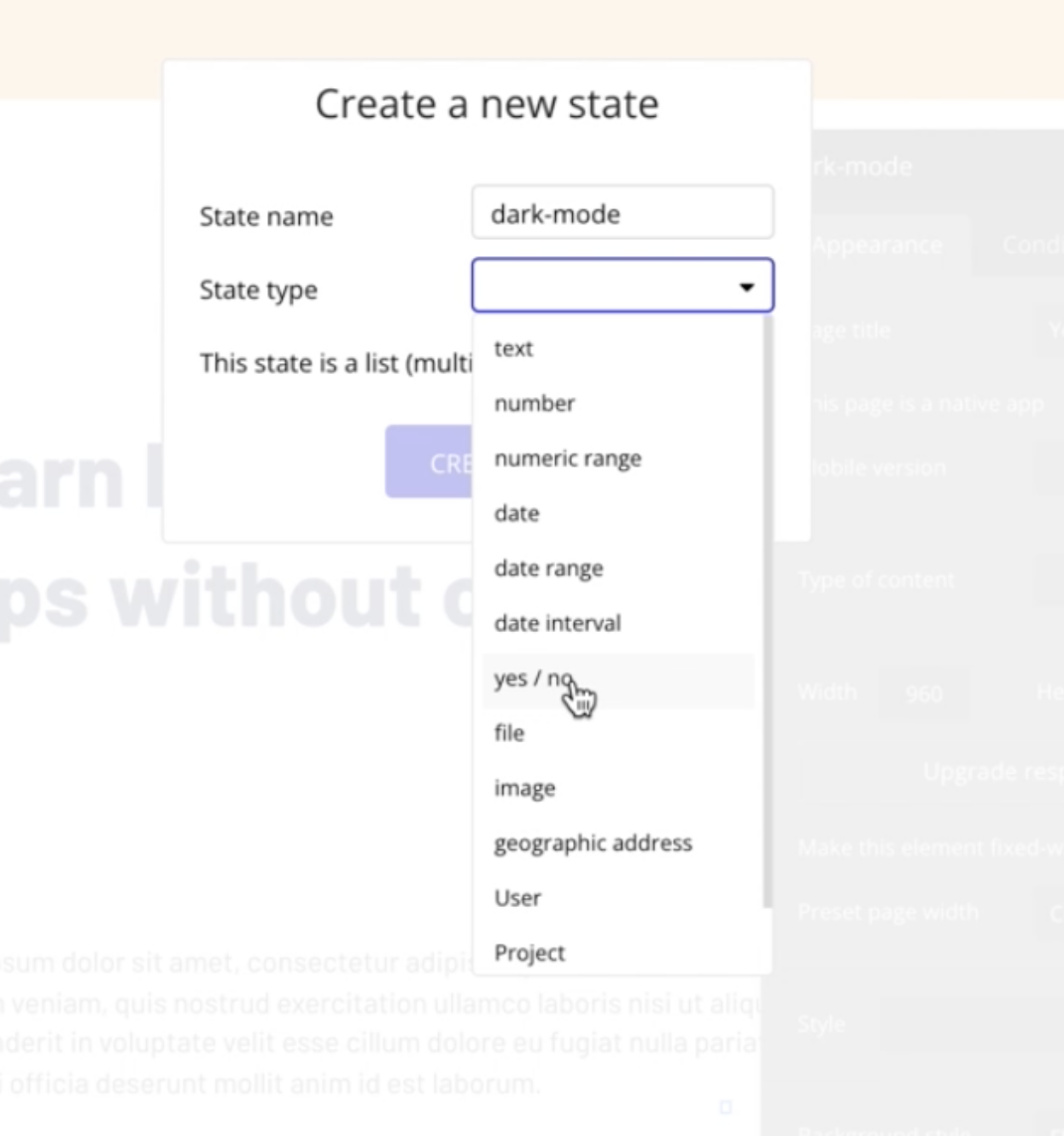 dark-mode라는 custom state를 설정한 후 yes, no 값을 부여하고