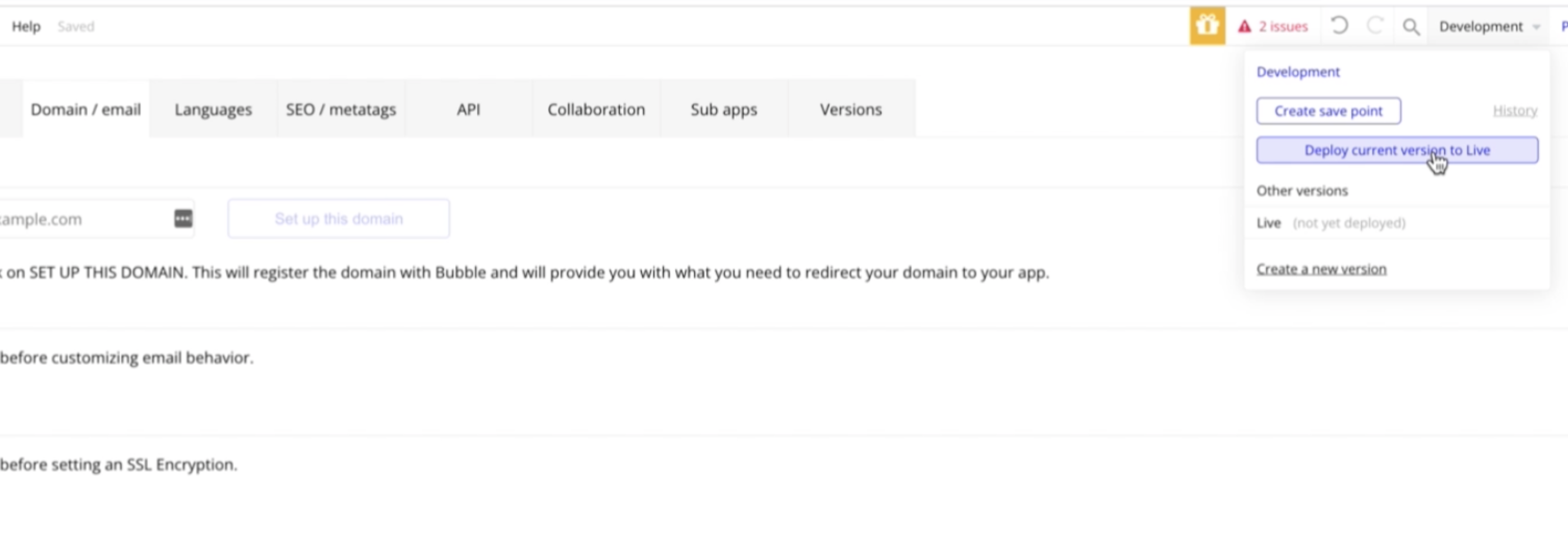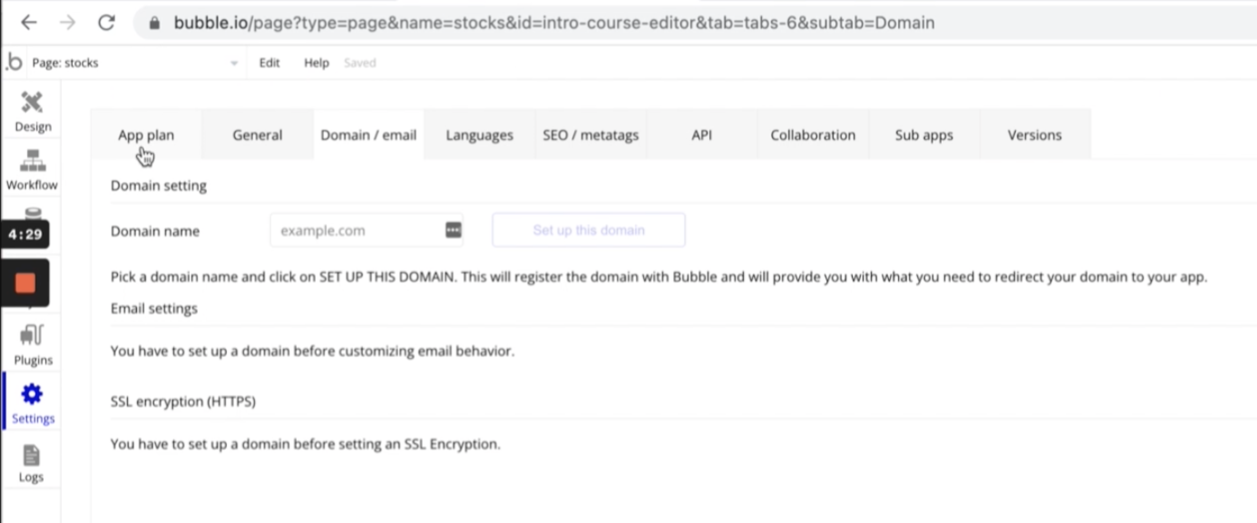 Adding custom domain within Bubble: 왼편 세팅에서 Domain / email 항목으로 이동.