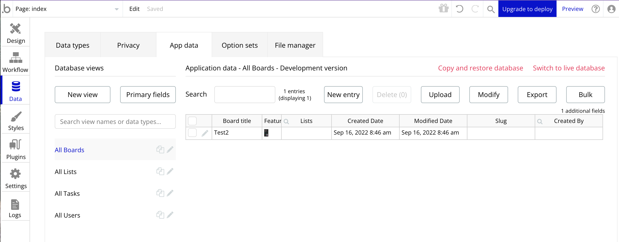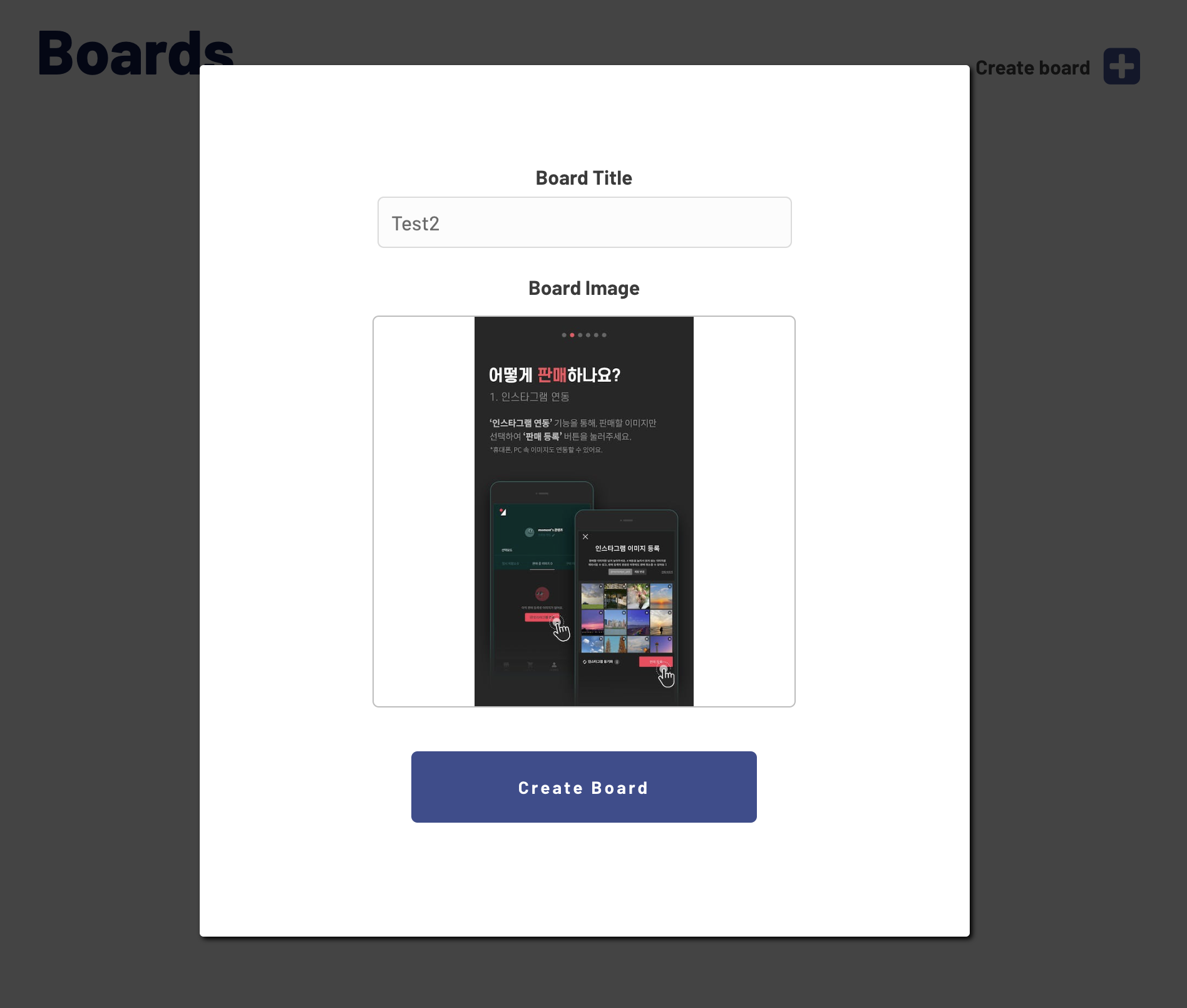 강의 내용을 따라서 만든 첫 기능. Create board 아이콘을 클릭하면 팝업 창이 뜨고, 보드 제목과 이미지를 추가하면, DB에 쌓이는 기능.