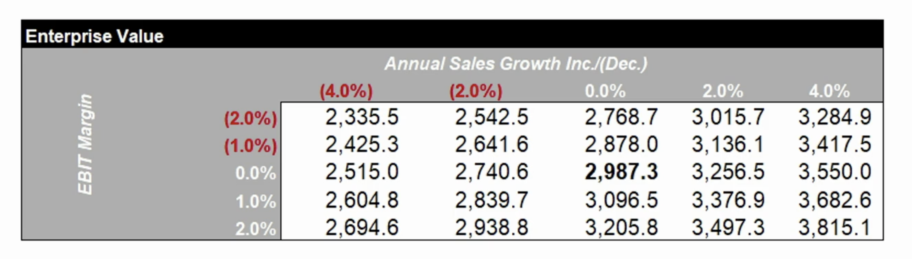 2) EBIT (? 아직 뭔지 모름) Margin과 연간 매출증감율에 따라 평가된 가치 금액을 여러 숫자로 펼침