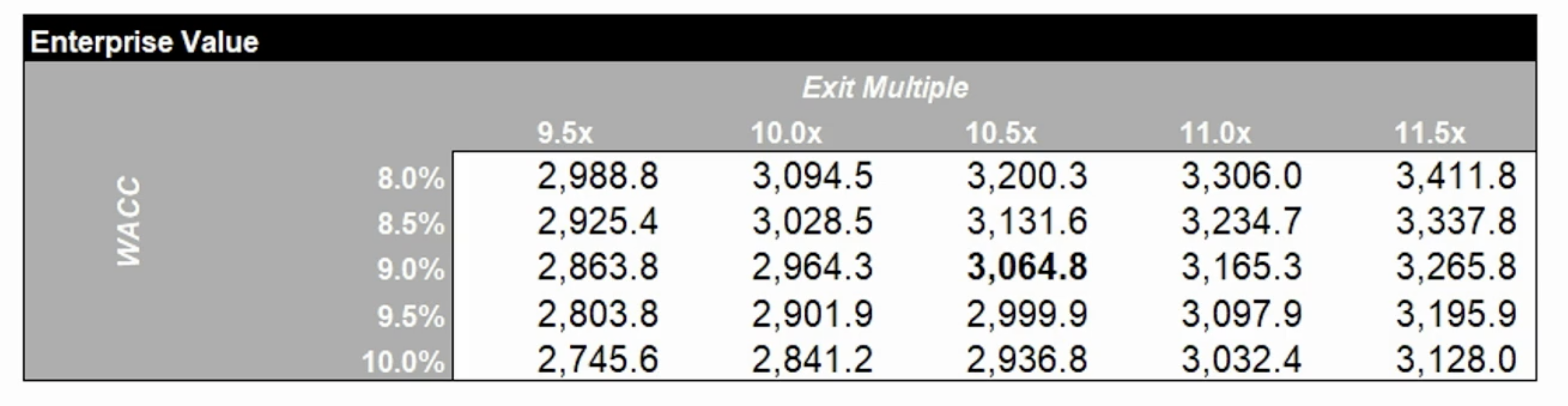 1) WACC - Weighted Average Cost of Capital (가중평균자본비용)과 Exit Multiple에 따라 평가된 가치의 금액을 여러 숫자로 펼침