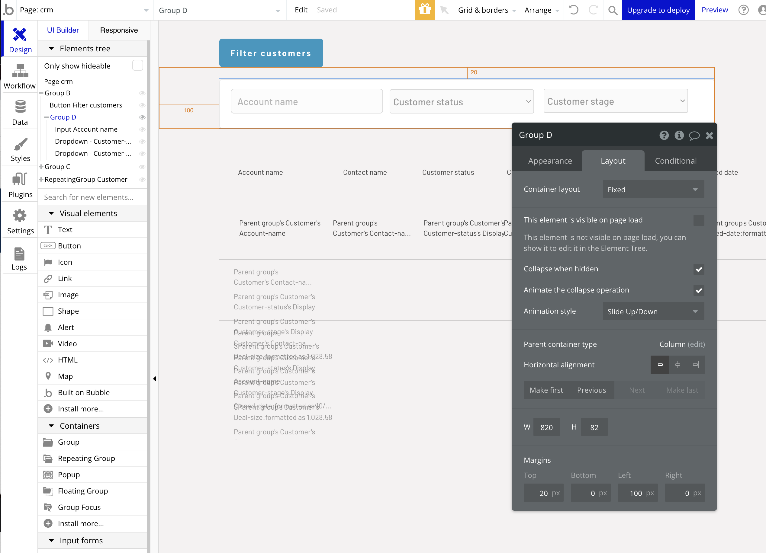 Filter를 만드는 과정에서 'Collapse this element's height when hidden' 옵션 찾기 어려움.