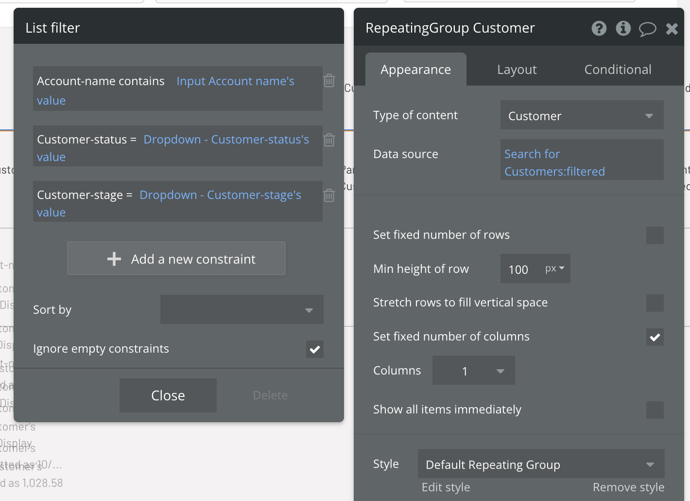 1) repeating group의 설정을 search for value 에서 :filtered 를 추가해주고