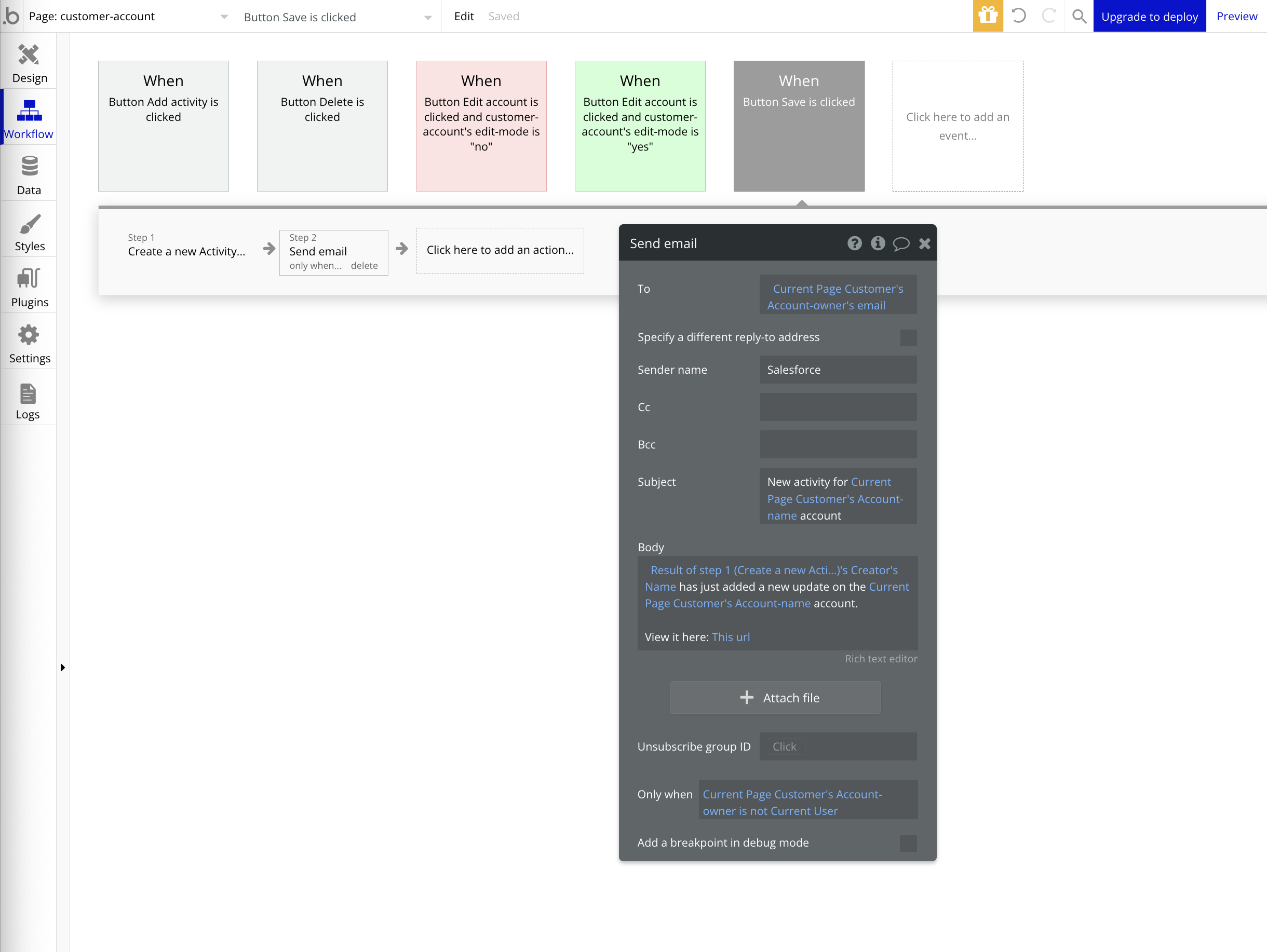 위에서 Save 버튼을 클릭할 때, 변경에 대한 알림 이메일을 보낼 수 있도록 설정 (Only when Account owner가 current user가 아닌 경우에만)