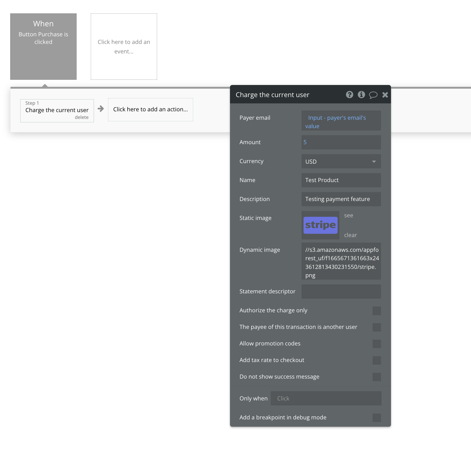 방법1은, 아래와 같이 Workflow 상에서 Stripe 플러그인을 실행시켜 결제 금액만 넣어주면,,
