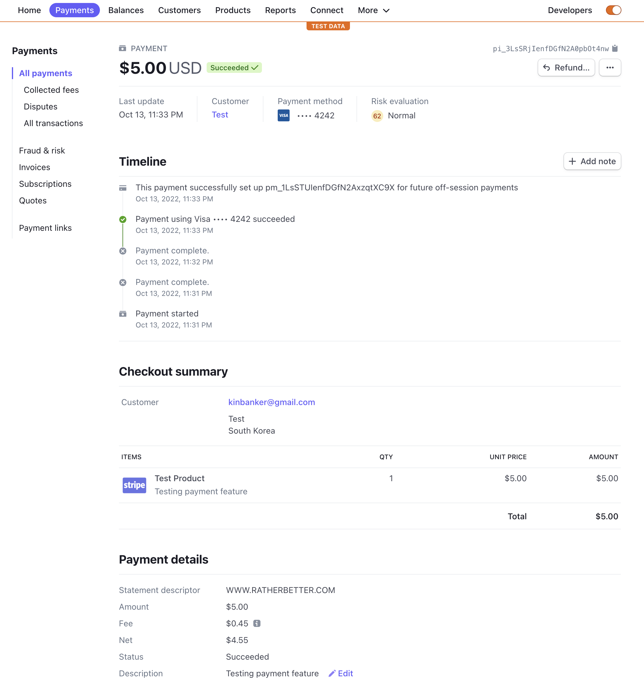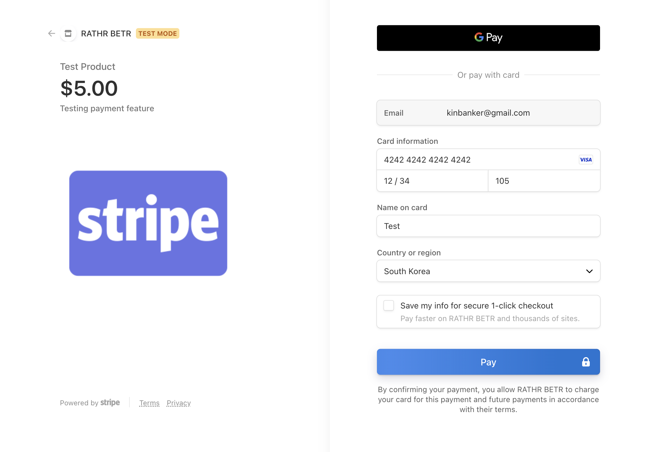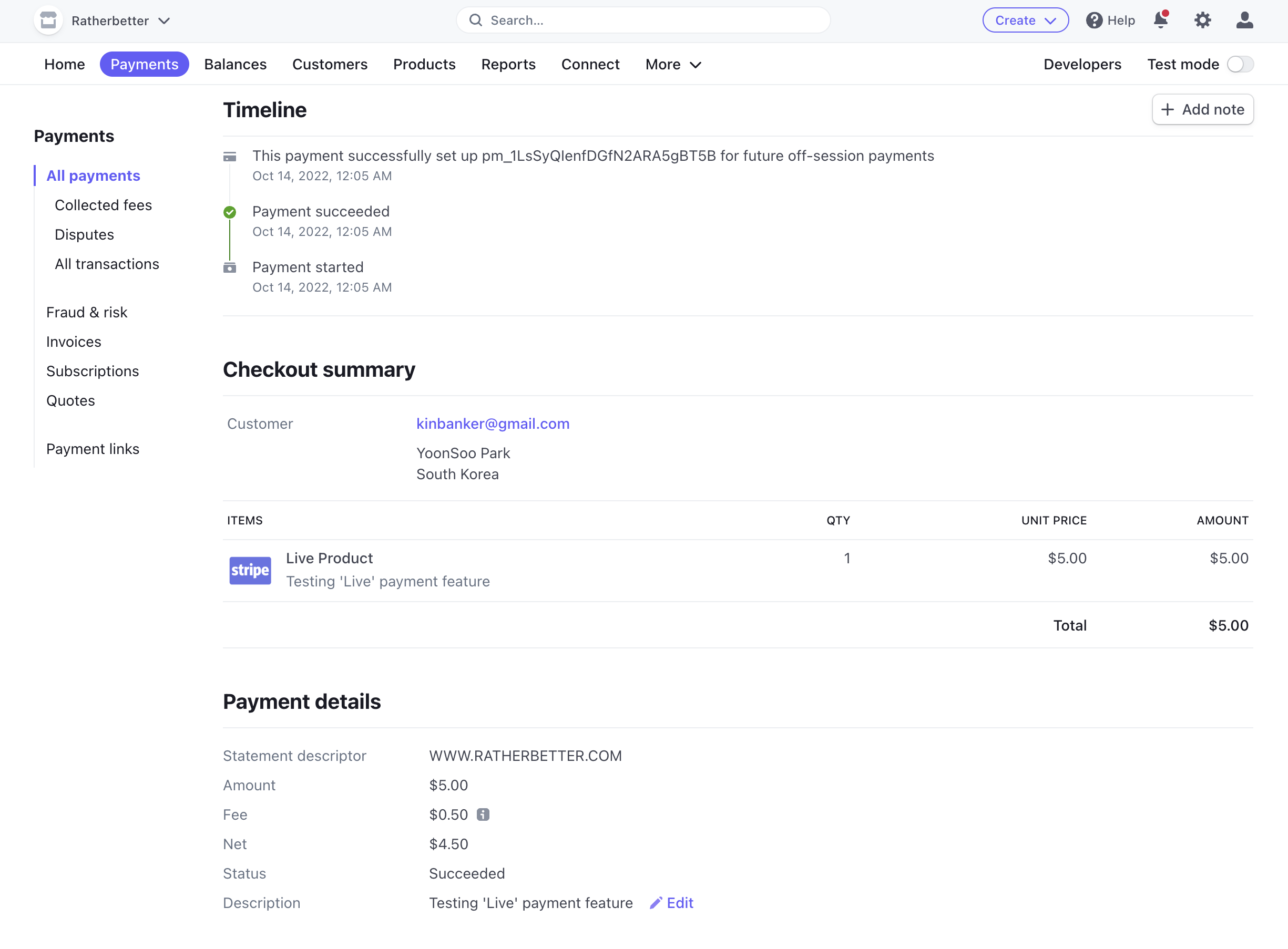 테스트 결제는 정상적으로 완료되었다. 과연 Live 결제도 가능할지 Stripe 모드를 변경해서 결제 진행해보자.