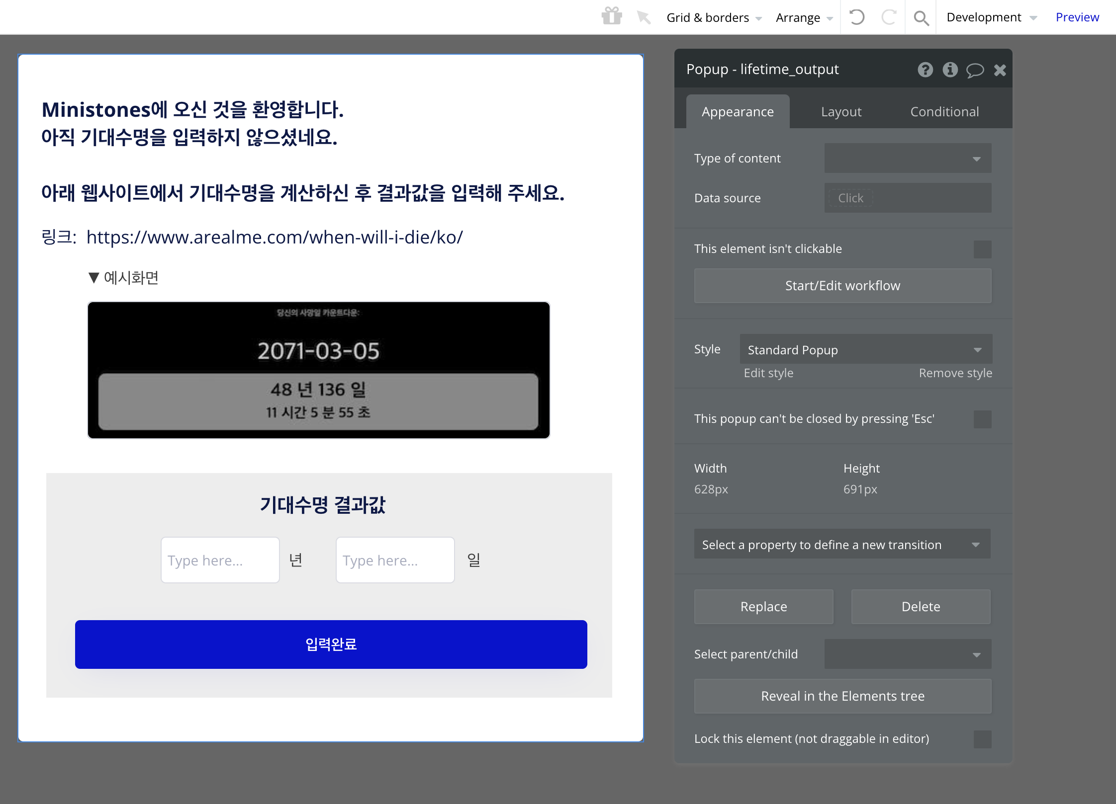 사용자가 회원가입 또는 로그인 이후, 기대수명(result_yr AND result_days) 값을 입력하지 않은 경우, 아래 팝업이 자동으로 뜨도록 했다. 사용자는 최초 로그인 시 아래 팝업에서 기대수명 결과값을 입력해야 한다.
