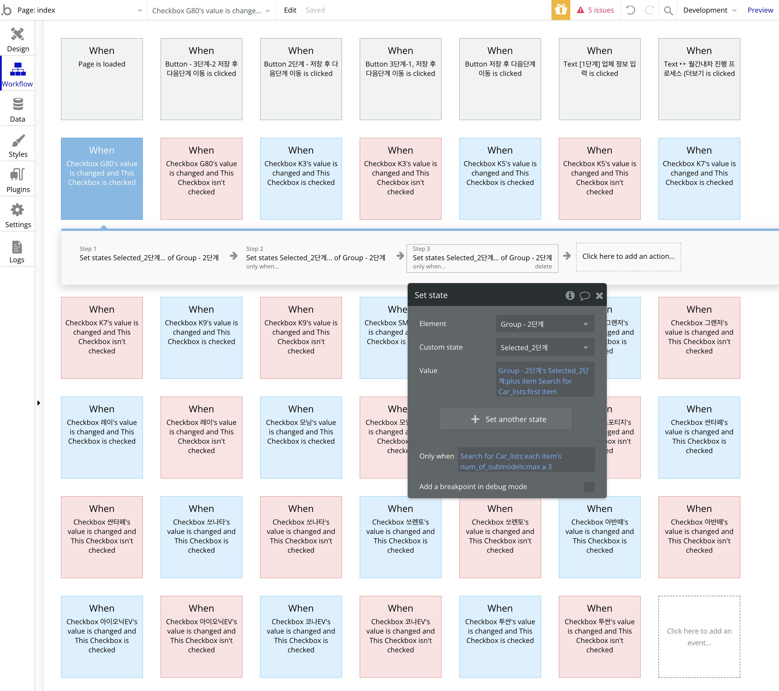 파란색 = checked 되었을 때 checked 된 모델(예: 모닝)의 서브모델 (예: 더 뉴 모닝(2세대), 올 뉴 모닝(3세대), 모닝 어반(4세대))들을 'Selected_2단계'라는 custom_state(list type) 에 추가하는 행동