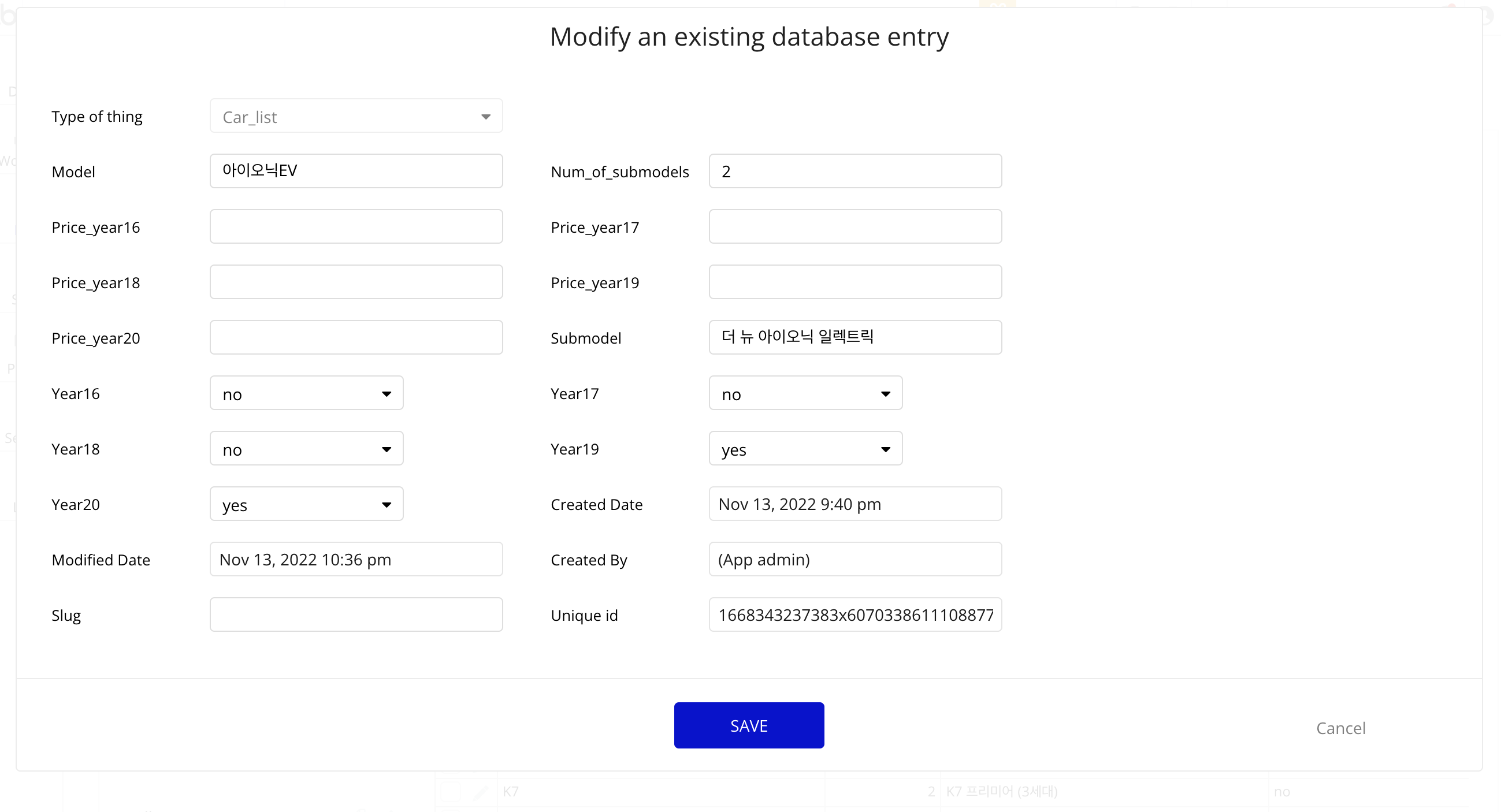 업체가 차량을 등록할 때 연식별 입금가를 혼동없이 작성하도록 하기 위해서는, 해당 서브모델(예: 아반떼 AD)의 연식 range를 제시해주어야 한다. 예를 들어 아반떼 AD는 16년식부터 19년식까지 있는데, 업체에게 20년식의 AD 입금가 input field를 제시할 필요는 없기 때문이다.
