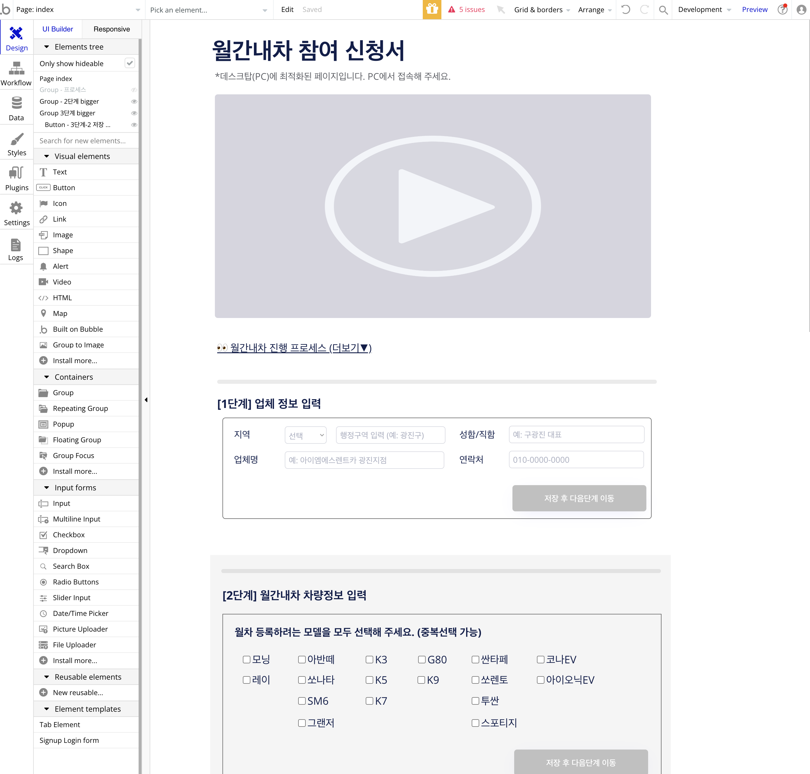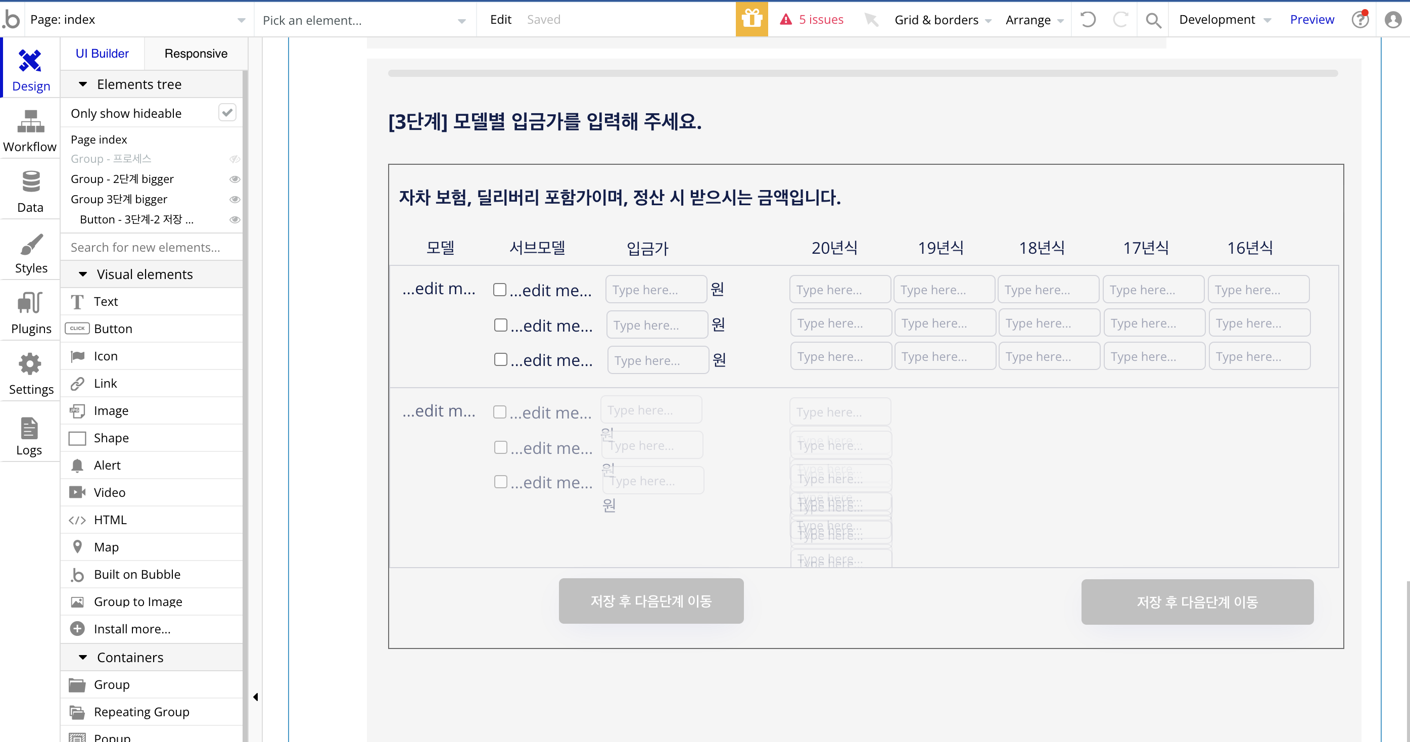 그리고 위에서부터 하나씩 워크플로우를 만들어간다. 모든 단계들은 [저장 후 다음단계 이동] 버튼을 클릭 시에 나타나도록 하여, 렌트카 업체 담당자가 입력해야할 field를 최소한으로 유지한다.