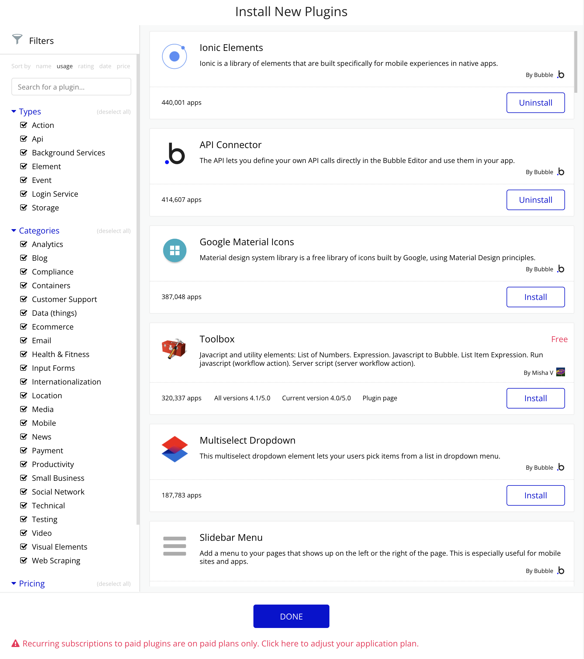 - Plugins & integrations: 근래 모듈화되어 있는 서비스들이 많아서 외부 api만 잘 활용해도 매우 빠르게 서비스 구성 가능 (매시업). 버블 커뮤니티 내에서 다른 개발자들이 만든 플러그인도 유료/무료로 사용할 수 있음