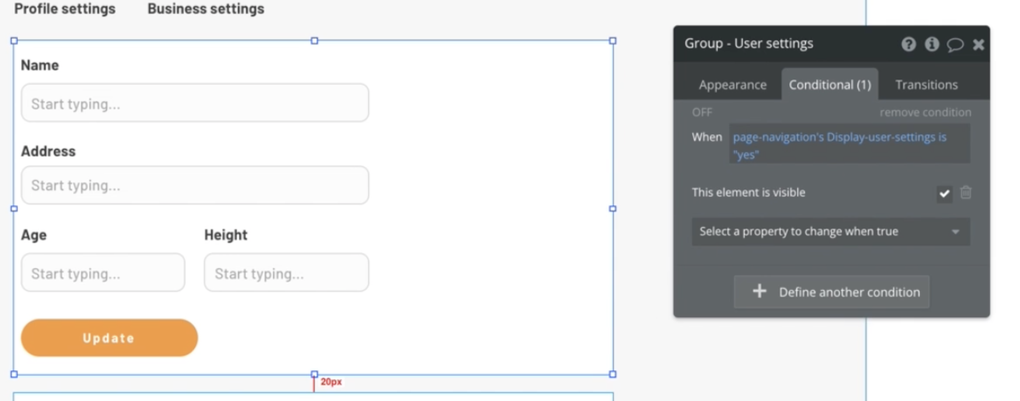 Condition을 걸어서 page-navigation's Display-user-settings 값이 yes일 때,