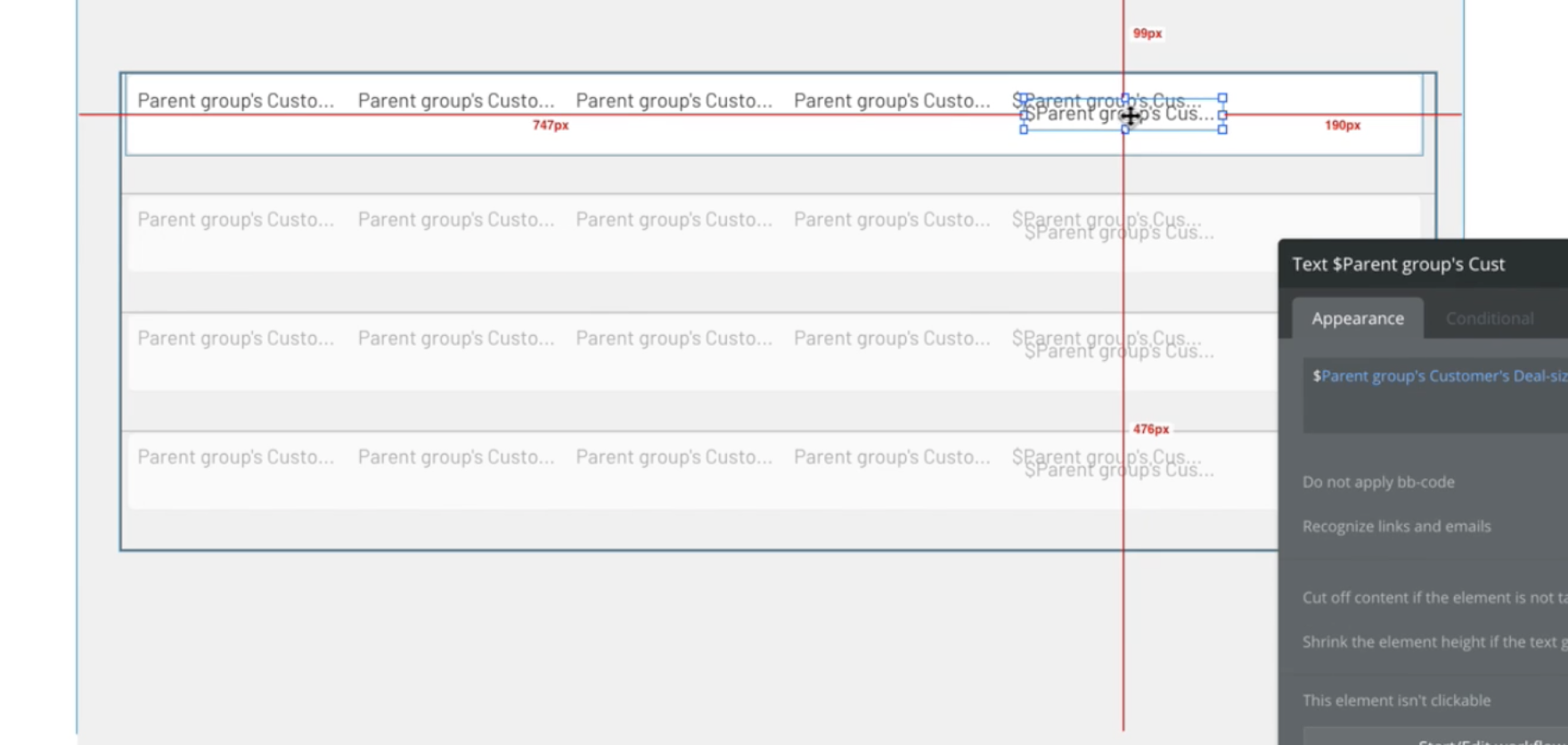 ? Repeating group 생성 후 각각의 text element를 배열했는데, 왜 아래쪽 반복그룹에는 동일한 레이아웃이 나오지 않을까?