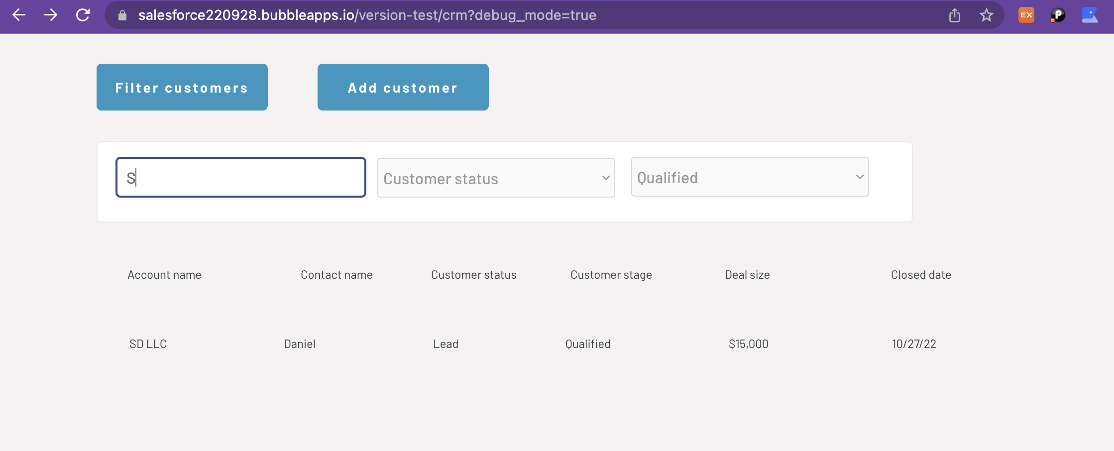 2) filtered 항목들에서 account-name includes input value / customer-status = dropdown value / customer-stage=dropdown value 설정을 해줘야 함