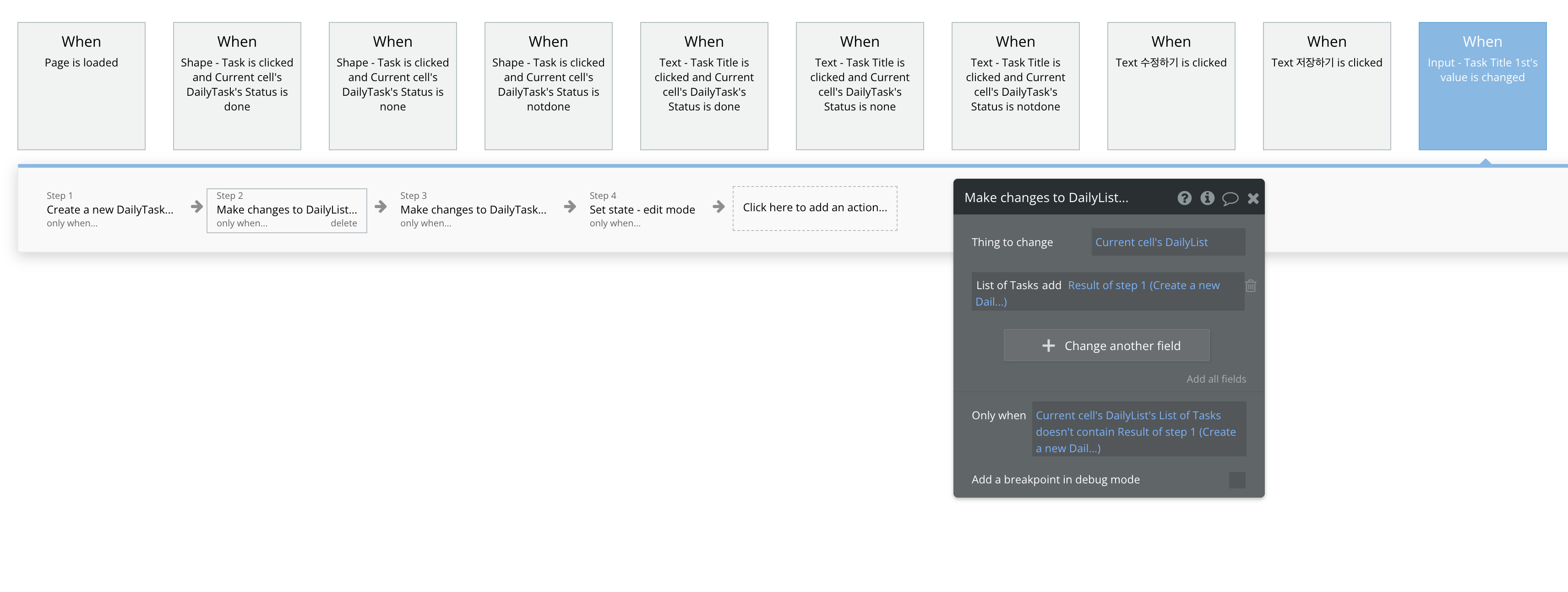 Page: index (=ver1) 에서는 RepeatingGroup - List 하위에 Task 이름을 입력받을 Input Field를 추가하였다. Input Field를 RepeatingGroup - List 에 추가해야만 DailyTask 생성 시 Day_applied에 Current cell's DayList 값을 저장할 수 있기 때문이다.